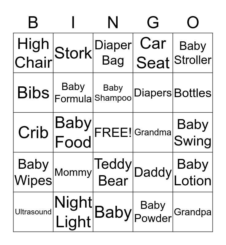 This bingo card has a free space and 24 words: Mommy, Night Light, Baby Shampoo, Ultrasound, Baby Stroller, High Chair, Bibs, Stork, Grandma, Teddy Bear, Diapers, Crib, Daddy, Baby Lotion, Baby Formula, Baby Powder, Baby Swing, Diaper Bag, Bottles, Baby Food, Grandpa, Baby Wipes, Car Seat and Baby.