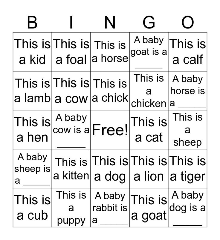 This bingo card has a free space and 24 words: This is a kitten, This is a puppy, This is a chick, This is a cub, This is a calf, This is a kid, This is a lamb, This is a foal, This is a cat, This is a dog, This is a chicken, This is a hen, This is a lion, This is a tiger, This is a cow, This is a goat, This is a sheep, This is a horse, A baby horse is a _____, A baby cow is a _____, A baby dog is a _____, A baby sheep is a _____, A baby goat is a _____ and A baby rabbit is a _____.