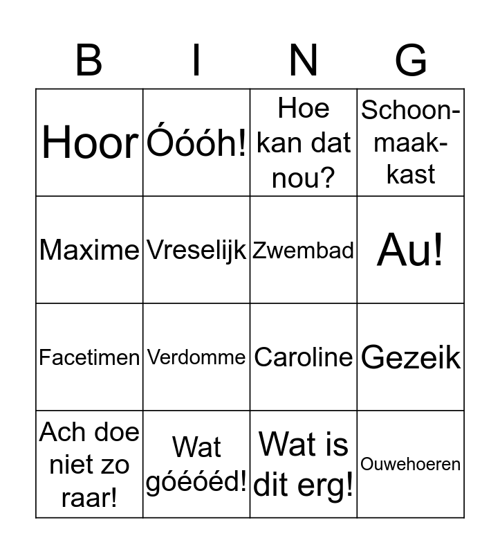 This bingo card has 30 words: Wat vervelend nou!, Brocante, Wat is dit erg!, Godver, Hoor, Óóóh!, Zwembad, Ouwehoeren, Na, na, na, Wat góéóéd!, Pipo, Gezeik, Nee, nee!, Wat leuk!, Caroline, Erica, Wat erg!, Verdomme, Kan toch niet!, Schoon-maak-kast, Ach doe niet zo raar!, Bommel, Hoe kan dat nou?, Au!, Maxime, Vreselijk, Café, Ik haat het!, Facetimen and Kruiwagen.