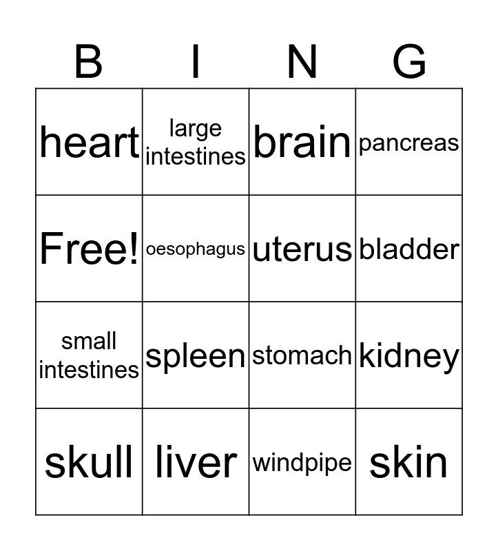 This bingo card has 16 words: liver, kidney, brain, heart, small intestines, large intestines, stomach, windpipe, Free!, oesophagus, skull, pancreas, spleen, bladder, uterus and skin.