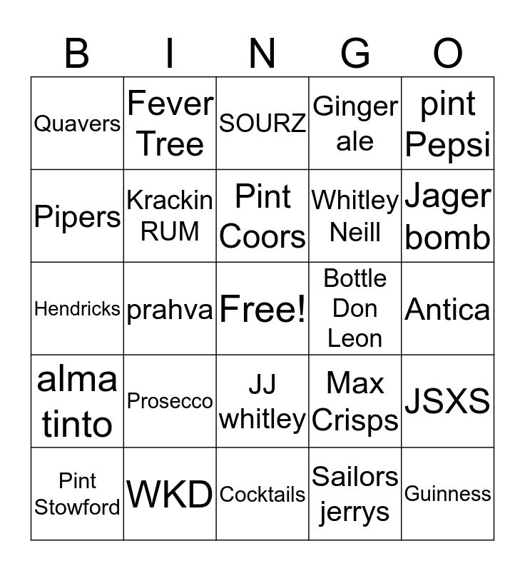 This bingo card has a free space and 24 words: Prosecco, WKD, Pint Coors, Pint Stowford, pint Pepsi, Quavers, Pipers, Fever Tree, Bottle Don Leon, JJ whitley, Whitley Neill, Hendricks, Max Crisps, JSXS, Krackin RUM, Sailors jerrys, Antica, SOURZ, Jager bomb, prahva, Guinness, alma tinto, Ginger ale and Cocktails.