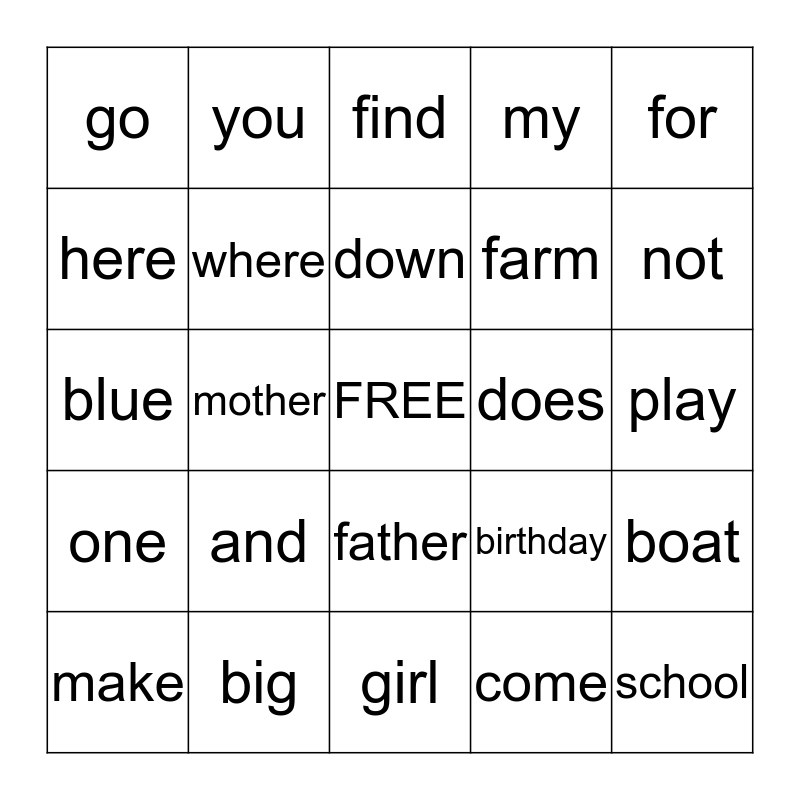 This bingo card has a free space and 24 words: and, big, down, make, for, go, here, you, does, father, farm, blue, birthday, boat, where, come, play, find, not, mother, school, one, my and girl.