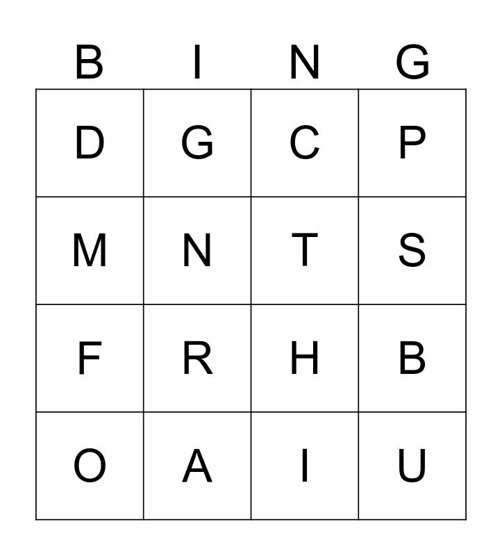 This bingo card has 16 words: A, B, C, D, F, G, H, I, M, N, O, P, R, S, T and U.