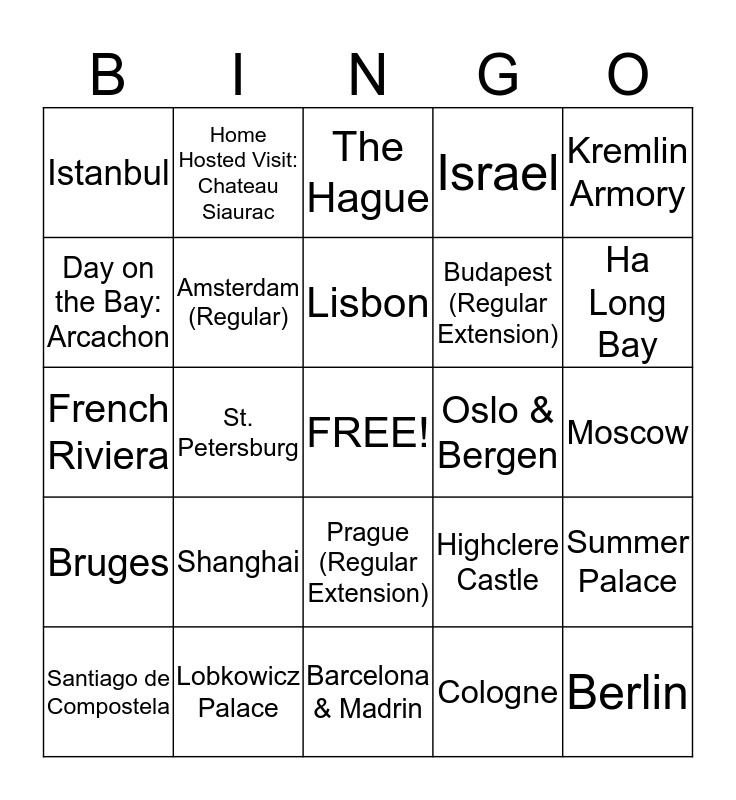 This bingo card has a free space and 24 words: Shanghai, Lobkowicz Palace, Lisbon, Santiago de Compostela, Kremlin Armory, Istanbul, Day on the Bay: Arcachon, Home Hosted Visit: Chateau Siaurac, Oslo & Bergen, Prague (Regular Extension), Budapest (Regular Extension), French Riviera, Highclere Castle, Summer Palace, Amsterdam (Regular), Cologne, Moscow, The Hague, Ha Long Bay, St. Petersburg, Berlin, Bruges, Israel and Barcelona & Madrin.