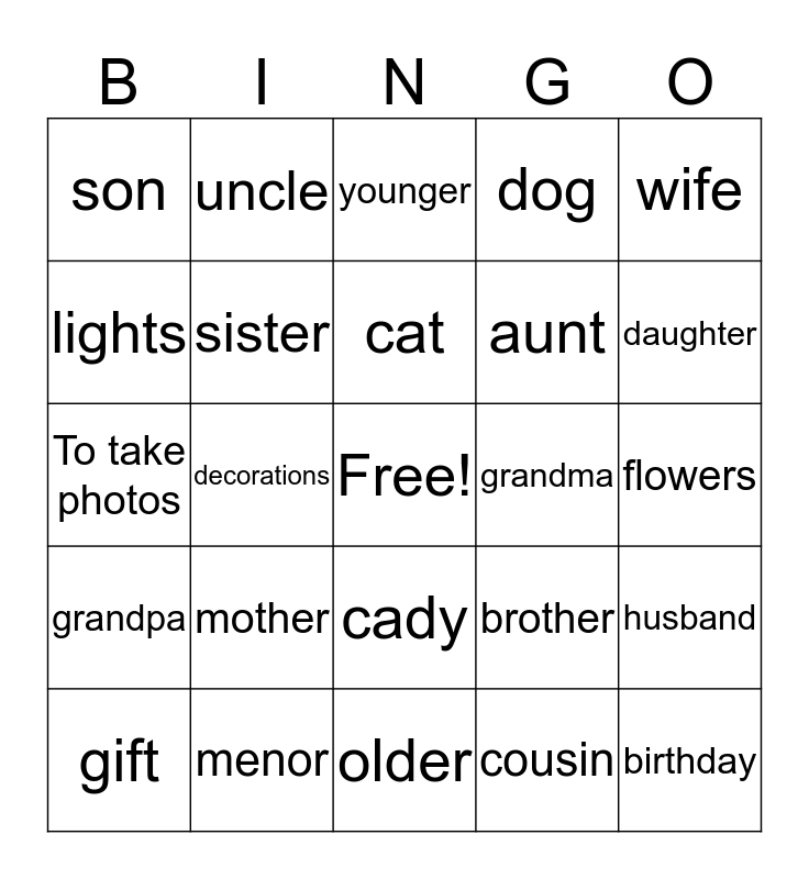 This bingo card has a free space and 24 words: mother, menor, cat, gift, wife, son, lights, uncle, grandma, cady, aunt, To take photos, brother, husband, sister, cousin, flowers, younger, daughter, decorations, birthday, grandpa, dog and older.