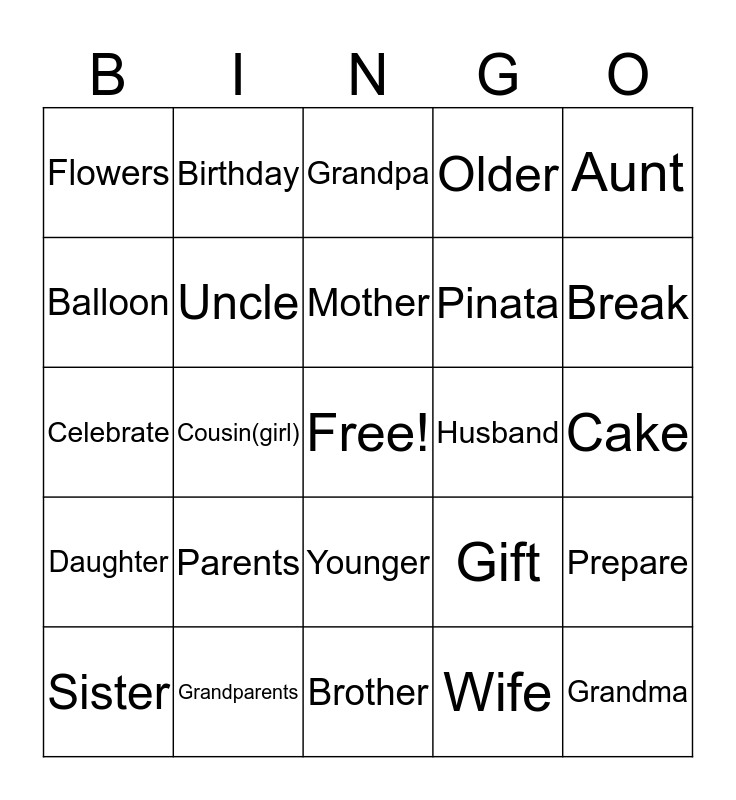 This bingo card has a free space and 29 words: Cousin(boy), Grandparents, Grandpa, Son, Aunt, Flowers, Uncle, Mother, Husband, Prepare, Sister, Cousin(girl), Wife, Grandma, Celebrate, Lights, Brother, Gift, Break, Daughter, Parents, Father, Pinata, Cake, Balloon, Birthday, Younger, Older and Candy.