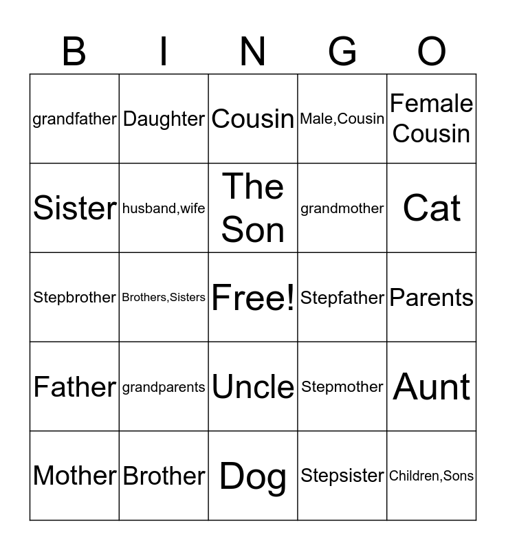 This bingo card has a free space and 24 words: grandparents, Brother, The Son, Mother, Female Cousin, grandfather, Sister, Daughter, Stepfather, Uncle, grandmother, Stepbrother, Stepmother, Aunt, husband,wife, Stepsister, Parents, Cousin, Cat, Brothers,Sisters, Children,Sons, Father, Male,Cousin and Dog.
