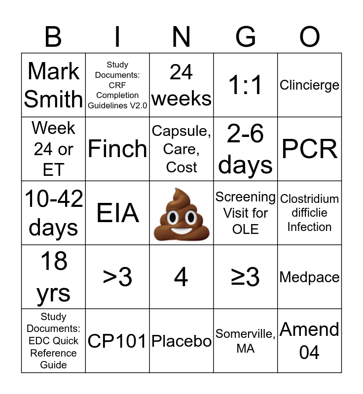 This bingo card has a free space and 24 words: >3, CP101, Capsule, Care, Cost, Study Documents: EDC Quick Reference Guide, Clincierge, Mark Smith, Week 24 or ET, Study Documents: CRF Completion Guidelines V2.0, Screening Visit for OLE, 4, 2-6 days, 10-42 days, ≥3, Medpace, Finch, Somerville, MA, Clostridium difficlie Infection, 24 weeks, PCR, EIA, Amend 04, 18 yrs, 1:1 and Placebo.