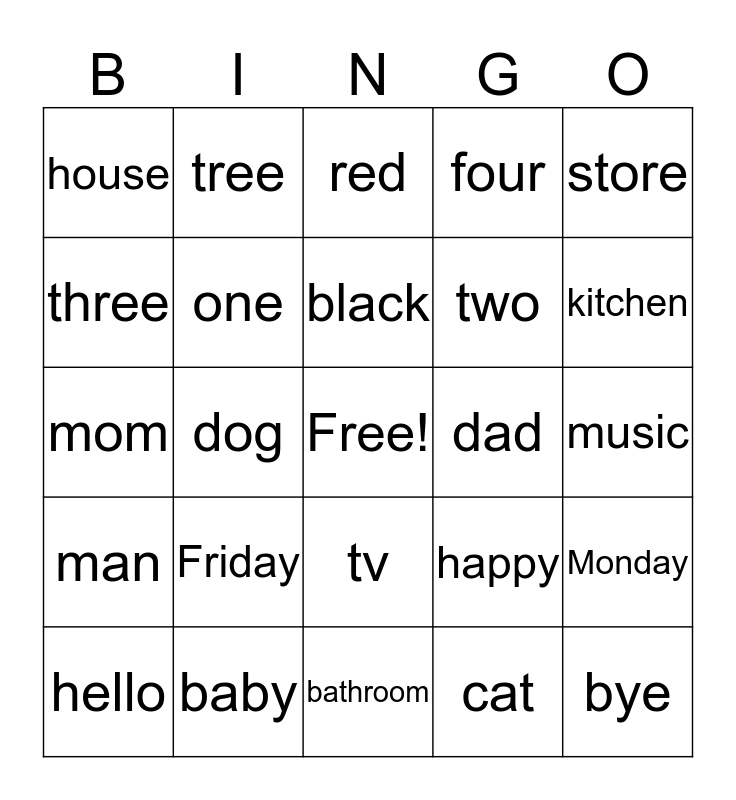 This bingo card has a free space and 29 words: hello, car, dog, church, house, red, one, Friday, dad, baby, music, bye, bathroom, cat, kitchen, woman, tv, man, store, mom, happy, Sunday, two, three, four, tree, Monday, black and tree.
