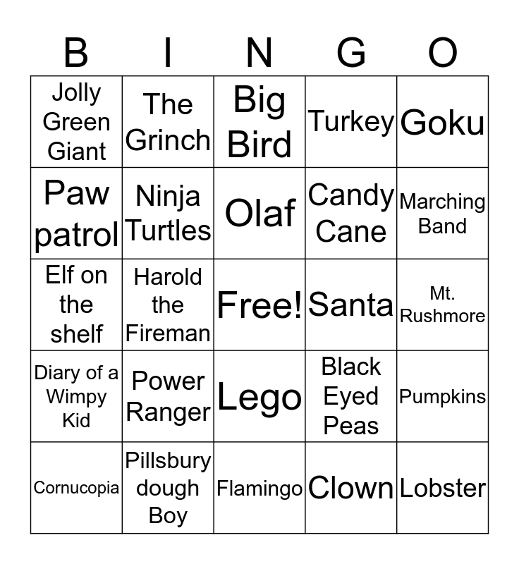 This bingo card has a free space and 34 words: Snoopy, Clown, Spongebob, Giraffe, Diary of a Wimpy Kid, Ninja Turtles, Goku, Cornucopia, The Grinch, Ronald Mcdonald, Olaf, Big Bird, Pikachu, Trolls, Santa, Marching Band, Pillsbury dough Boy, Elf on the shelf, Power Ranger, Black Eyed Peas, Lego, Cracker Barrel, Jolly Green Giant, Mt. Rushmore, Flamingo, Lobster, Turkey, Smokey Bear, Candy Cane, Paw patrol, Ice Cream Cone, Harold the Fireman, Pumpkins and Nutcracker.