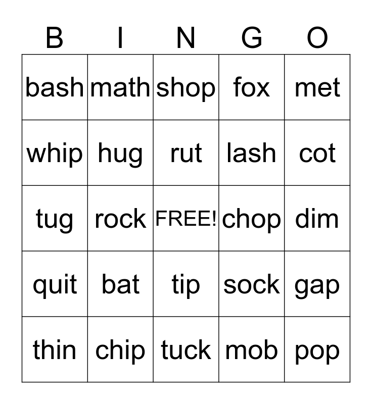This bingo card has a free space and 24 words: bat, chip, rut, thin, met, bash, whip, math, chop, tip, lash, tug, sock, gap, hug, mob, dim, shop, cot, rock, pop, quit, fox and tuck.
