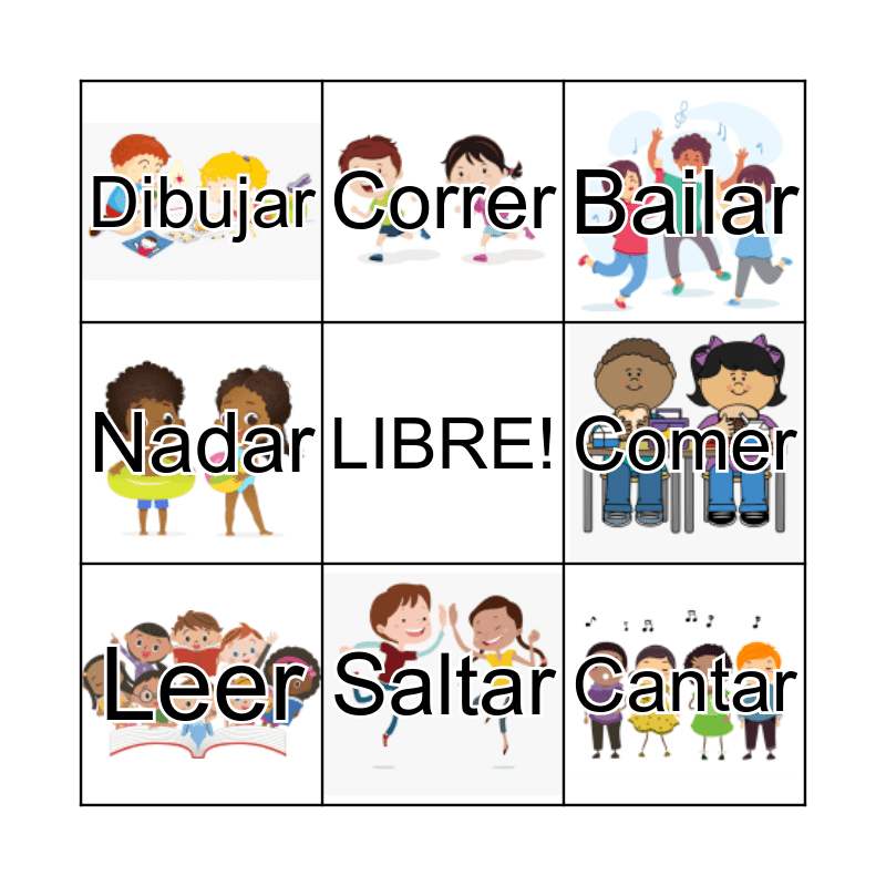 This bingo card has 10 images, a free space and 10 words: Saltar, Bailar, Dibujar, Cantar, Nadar, Leer, Correr, Jugar Deportes, Comer and Dormir.