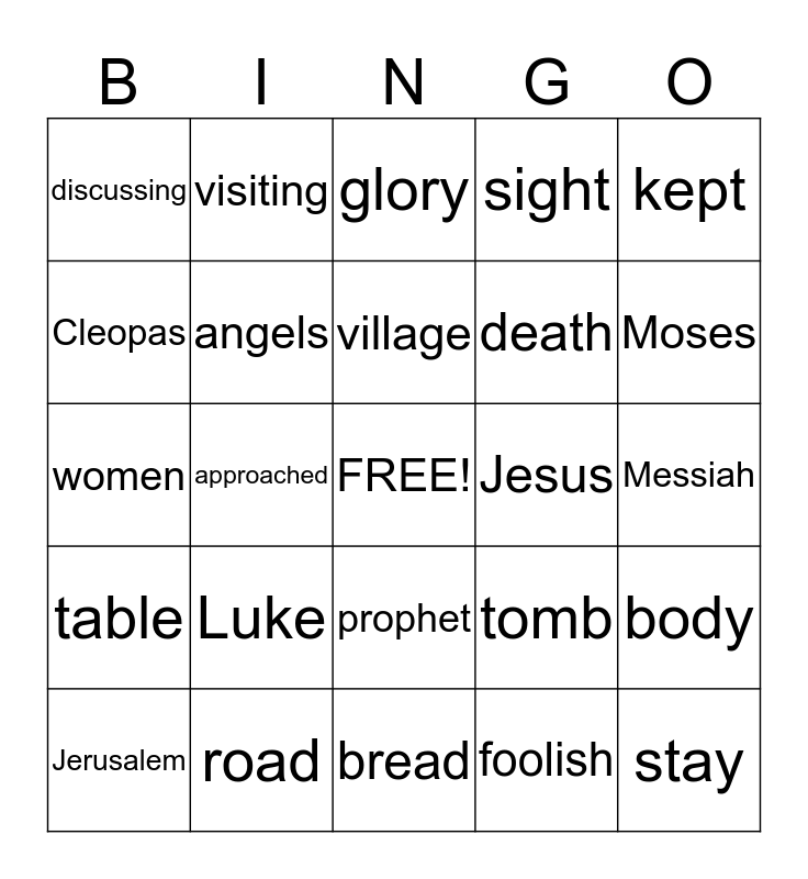 This bingo card has a free space and 24 words: Luke, road, village, Jerusalem, kept, discussing, Cleopas, visiting, Jesus, prophet, death, women, tomb, body, angels, foolish, Messiah, glory, Moses, approached, stay, table, sight and bread.