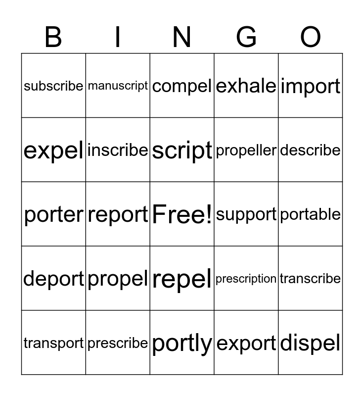 This bingo card has a free space and 24 words: propel, prescribe, script, transport, import, subscribe, expel, manuscript, support, repel, propeller, porter, prescription, transcribe, inscribe, export, portable, compel, describe, report, dispel, deport, exhale and portly.