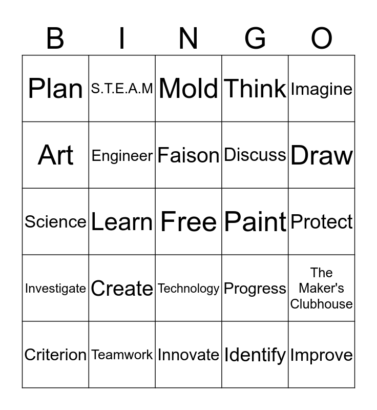 This bingo card has a free space and 29 words: Criterion, Test, Learn, Educate, Plan, Mold, Engineer, Create, Paint, Teamwork, Protect, Improve, Innovate, Identify, Draw, Math, Technology, Investigate, Imagine, Science, Progress, Sculpt, Discuss, Art, Think, S.T.E.A.M, The Maker's Clubhouse, Faison and Lincoln.