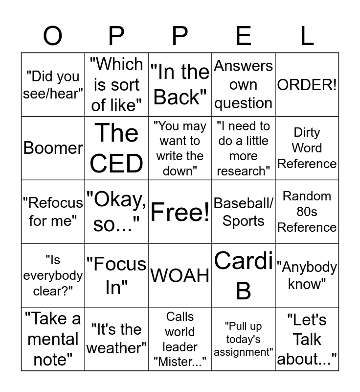 This bingo card has a free space and 24 words: "Focus In", "It's the weather", "You may want to write the down", "Take a mental note", ORDER!, "Did you see/hear", Boomer, "Which is sort of like", Baseball/ Sports, WOAH, "I need to do a little more research", "Refocus for me", Cardi B, "Anybody know", The CED, "Pull up today's assignment", Random 80s Reference, "In the Back", Dirty Word Reference, "Okay, so...", "Let's Talk about...", "Is everybody clear?", Answers own question and Calls world leader "Mister...".