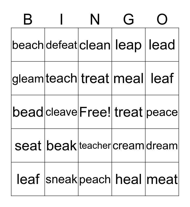 This bingo card has a free space and 24 words: beak, sneak, treat, leaf, lead, beach, gleam, defeat, treat, teacher, meal, bead, cream, dream, teach, heal, peace, clean, leaf, cleave, meat, seat, leap and peach.