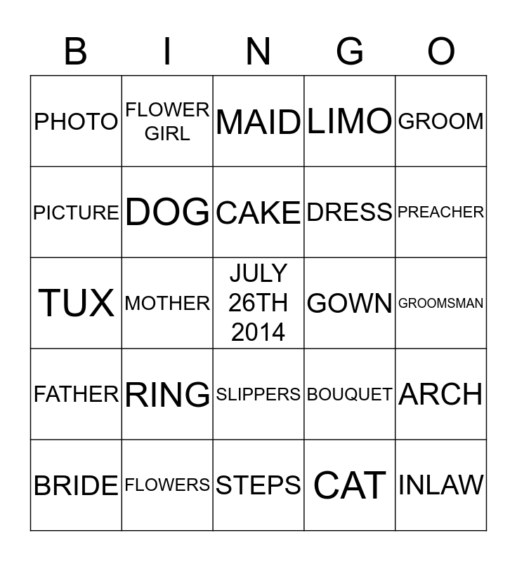 This bingo card has a free space and 24 words: RING, FLOWERS, CAKE, BRIDE, GROOM, PHOTO, PICTURE, FLOWER GIRL, GOWN, SLIPPERS, DRESS, TUX, BOUQUET, ARCH, DOG, CAT, GROOMSMAN, MAID, PREACHER, MOTHER, INLAW, FATHER, LIMO and STEPS.