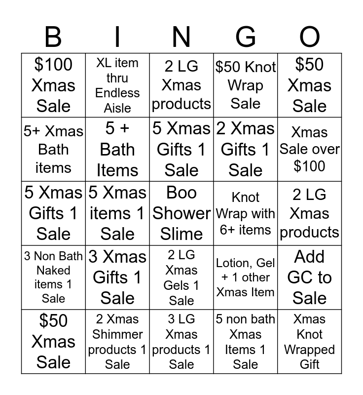 This bingo card has 25 words: 3 Xmas Gifts 1 Sale, 3 LG Xmas products 1 Sale, 5 Xmas Gifts 1 Sale, $50 Xmas Sale, $50 Xmas Sale, $100 Xmas Sale, 5+ Xmas Bath items, XL item thru Endless Aisle, Knot Wrap with 6+ items, 2 LG Xmas Gels 1 Sale, 2 Xmas Gifts 1 Sale, 5 Xmas Gifts 1 Sale, Lotion, Gel + 1 other Xmas Item, Add GC to Sale, 5 + Bath Items, Xmas Knot Wrapped Gift, 2 LG Xmas products, 2 LG Xmas products, Xmas Sale over $100, 5 Xmas items 1 Sale, Boo Shower Slime, 2 Xmas Shimmer products 1 Sale, 3 Non Bath Naked items 1 Sale, $50 Knot Wrap Sale and 5 non bath Xmas Items 1 Sale.
