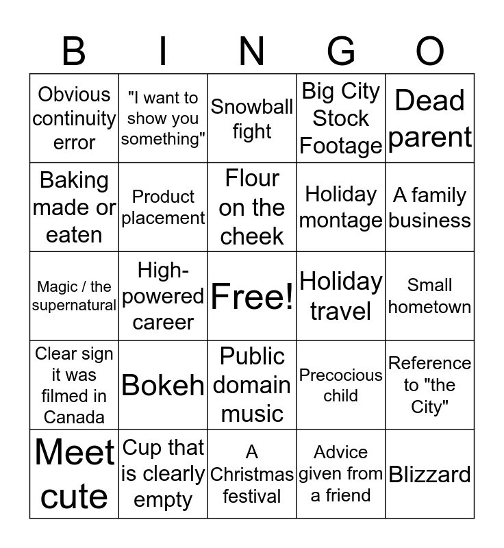 This bingo card has a free space and 24 words: Bokeh, Cup that is clearly empty, Flour on the cheek, Meet cute, Dead parent, Obvious continuity error, Baking made or eaten, "I want to show you something", Holiday travel, Public domain music, Holiday montage, Magic / the supernatural, Precocious child, Reference to "the City", Product placement, Advice given from a friend, Small hometown, Snowball fight, A family business, High-powered career, Blizzard, Clear sign it was filmed in Canada, Big City Stock Footage and A Christmas festival.
