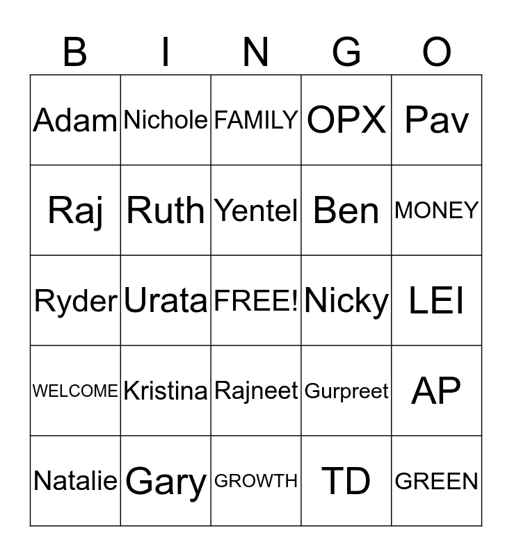 This bingo card has a free space and 24 words: Kristina, Gary, Yentel, Natalie, Pav, Adam, Raj, Nichole, Nicky, Rajneet, Ben, Ryder, Gurpreet, AP, Ruth, TD, LEI, FAMILY, MONEY, Urata, GREEN, WELCOME, OPX and GROWTH.