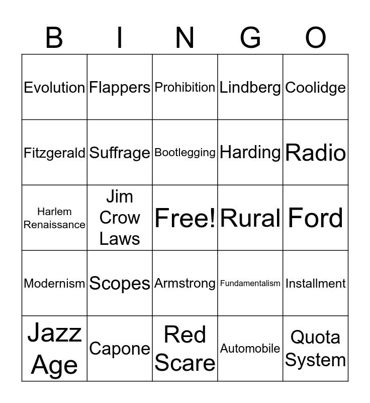 This bingo card has a free space and 26 words: Armstrong, Automobile, Bootlegging, Capone, Coolidge, Evolution, Fitzgerald, Flappers, Ford, Fundamentalism, Harding, Harlem Renaissance, Installment, Jazz Age, Jim Crow Laws, Ku Klux Klan, Lindberg, Modernism, Prohibition, Quota System, Radio, Red Scare, Rural, Scopes, Suffrage and Urban.