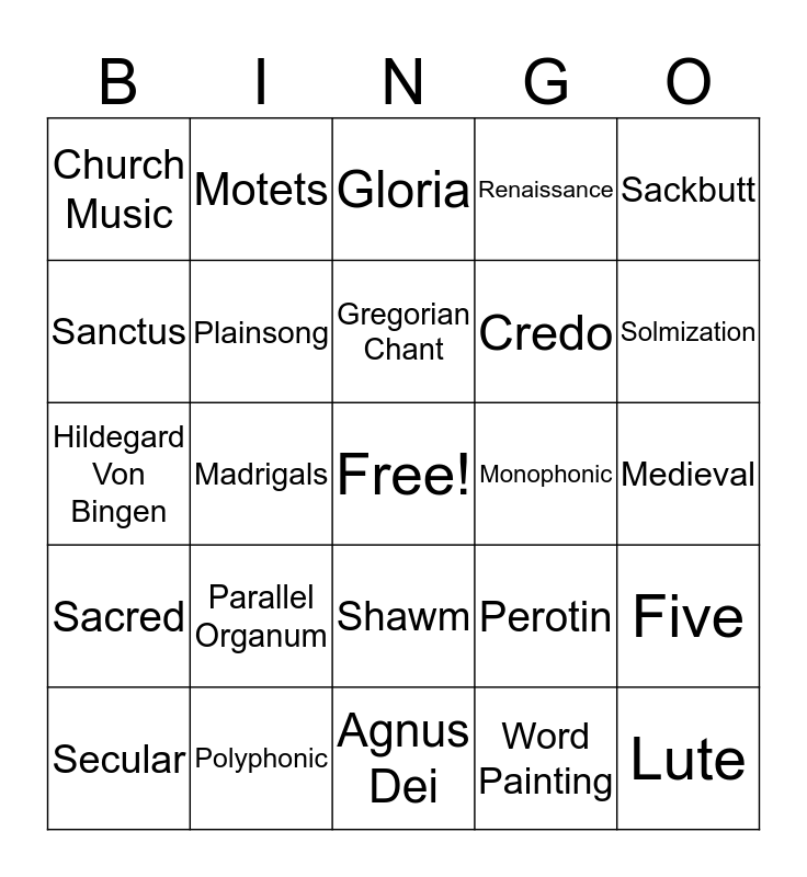 This bingo card has a free space and 27 words: Perotin, Kyrie, Credo, Agnus Dei, Sanctus, Gloria, Motets, Sacred, Monophonic, Five, Hildegard Von Bingen, Renaissance, Secular, Polyphonic, Solmization, Josquin Des Prez, Plainsong, Gregorian Chant, Parallel Organum, Church Music, Medieval, Word Painting, Madrigals, Lute, Shawm, Sackbutt and Organ.
