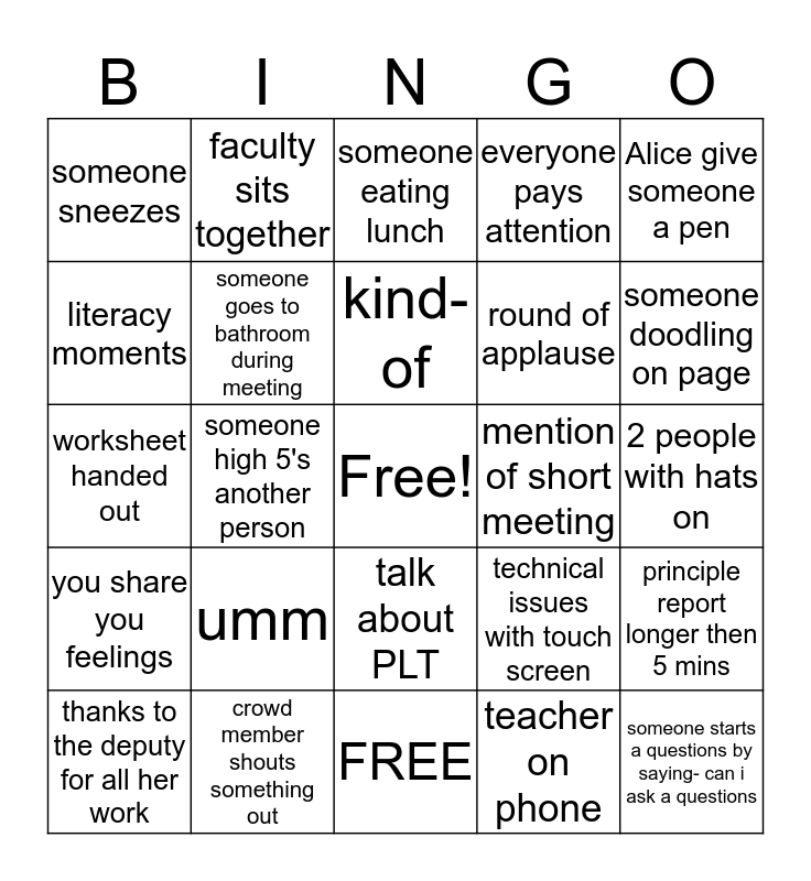 This bingo card has a free space and 24 words: umm, crowd member shouts something out, kind-of, thanks to the deputy for all her work, Alice give someone a pen, someone sneezes, literacy moments, faculty sits together, mention of short meeting, talk about PLT, round of applause, worksheet handed out, technical issues with touch screen, principle report longer then 5 mins, someone goes to bathroom during meeting, teacher on phone, 2 people with hats on, someone eating lunch, someone doodling on page, someone high 5's another person, someone starts a questions by saying- can i ask a questions, you share you feelings, everyone pays attention and FREE.