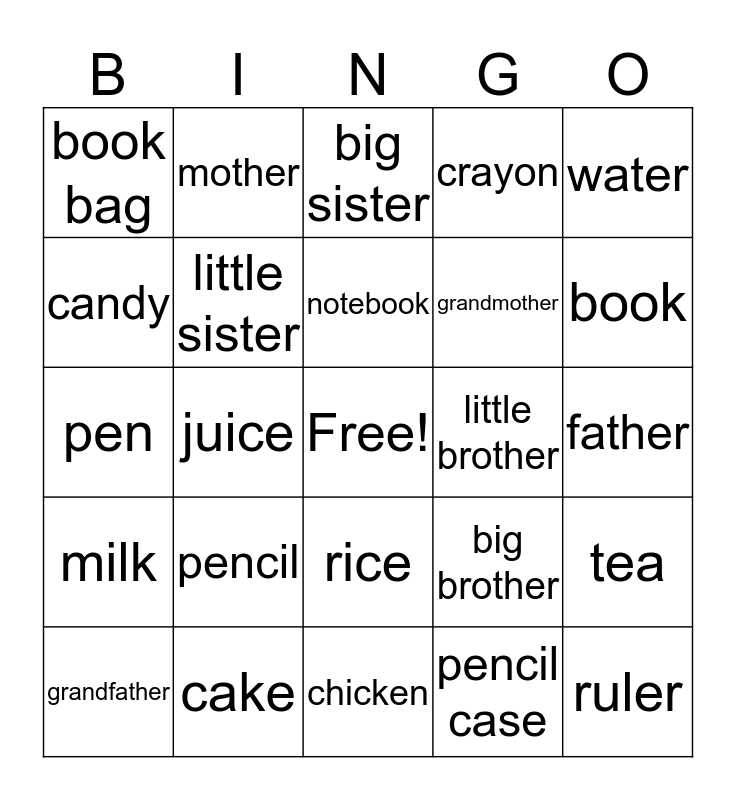 This bingo card has a free space and 24 words: grandfather, pencil, notebook, pencil case, water, book bag, mother, big sister, little brother, father, pen, little sister, big brother, tea, candy, cake, chicken, crayon, book, milk, juice, rice, grandmother and ruler.