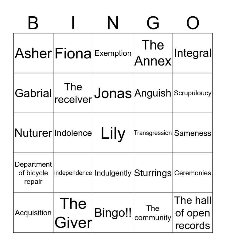 This bingo card has a free space and 24 words: independence, The Giver, Jonas, Acquisition, Integral, Asher, Gabrial, Fiona, Transgression, Indulgently, Anguish, Nuturer, Sturrings, Ceremonies, The receiver, The community, Sameness, Exemption, Scrupuloucy, Indolence, The hall of open records, Department of bicycle repair, The Annex and Bingo!!.
