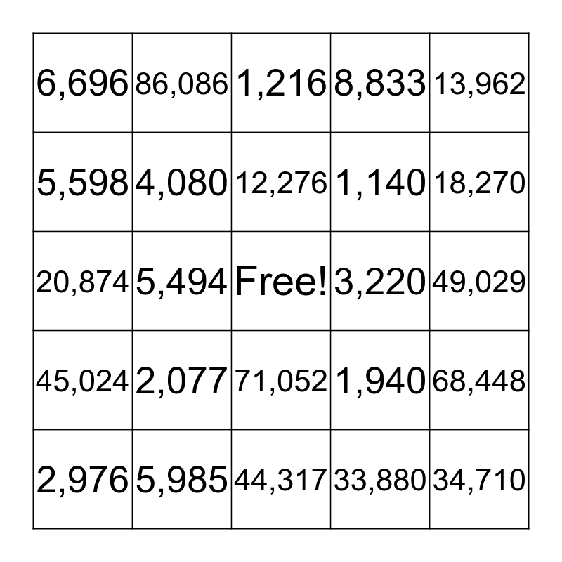 This bingo card has a free space and 29 words: 2,976, 7,387, 5,494, 9,009, 6,696, 1,216, 4,080, 2,077, 3,220, 5,985, 49,029, 34,710, 44,317, 33,880, 18,270, 5,334, 71,052, 45,024, 13,962, 20,874, 1,940, 2,925, 1,140, 5,598, 8,833, 86,086, 68,448, 12,276 and 6,864.