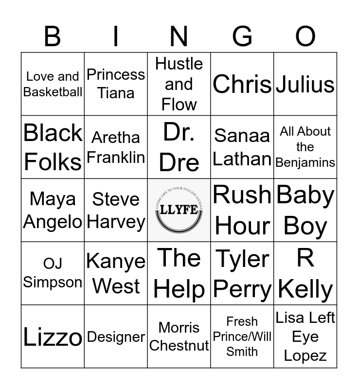 This bingo card has a free space and 24 words: Kanye West, Designer, Dr. Dre, Lizzo, Julius, Love and Basketball, Black Folks, Princess Tiana, Rush Hour, The Help, Sanaa Lathan, Maya Angelo, Tyler Perry, R Kelly, Aretha Franklin, Fresh Prince/Will Smith, Baby Boy, Hustle and Flow, All About the Benjamins, Steve Harvey, Lisa Left Eye Lopez, OJ Simpson, Chris and Morris Chestnut.