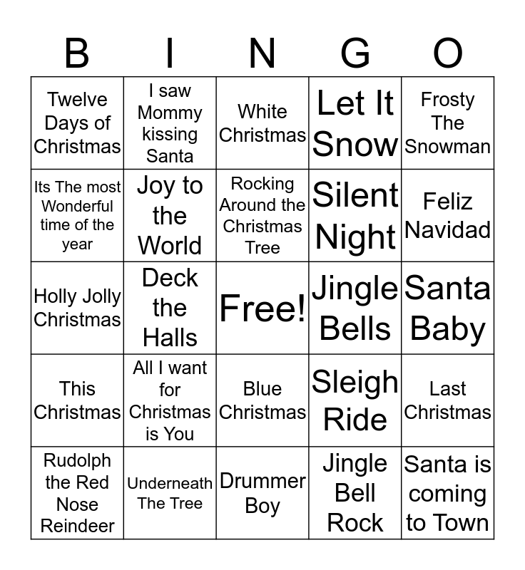 This bingo card has a free space and 24 words: All I want for Christmas is You, Underneath The Tree, Rocking Around the Christmas Tree, Rudolph the Red Nose Reindeer, Frosty The Snowman, Twelve Days of Christmas, Its The most Wonderful time of the year, I saw Mommy kissing Santa, Jingle Bells, Blue Christmas, Silent Night, Holly Jolly Christmas, Sleigh Ride, Last Christmas, Joy to the World, Jingle Bell Rock, Santa Baby, White Christmas, Feliz Navidad, Deck the Halls, Santa is coming to Town, This Christmas, Let It Snow and Drummer Boy.