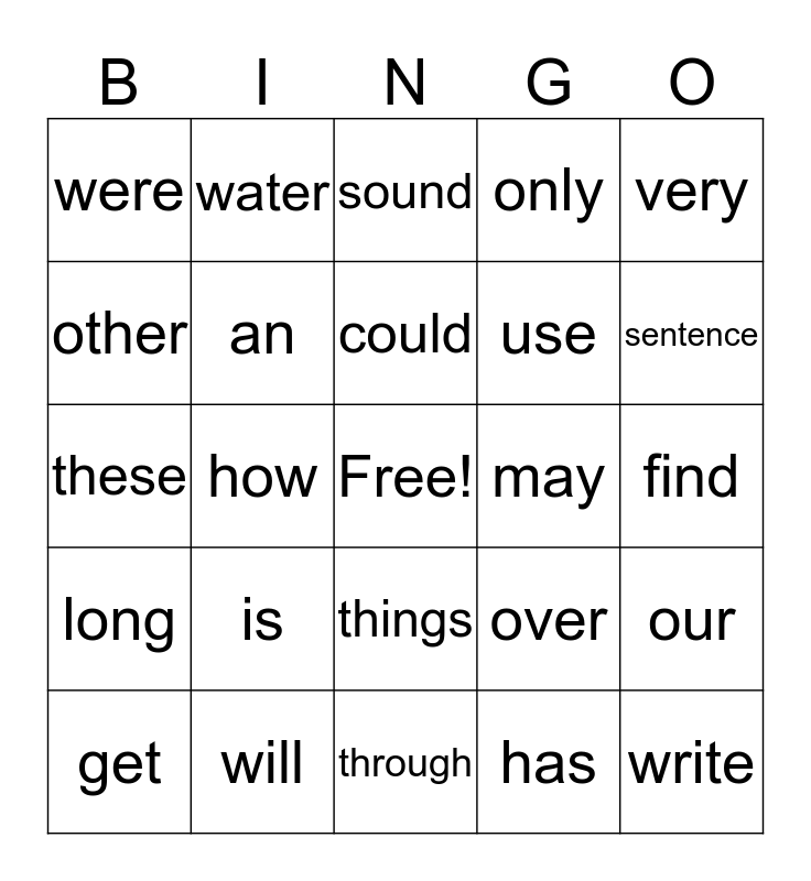 This bingo card has a free space and 24 words: is, will, could, get, very, were, other, water, may, things, use, these, over, our, an, has, find, sound, sentence, how, write, long, only and through.