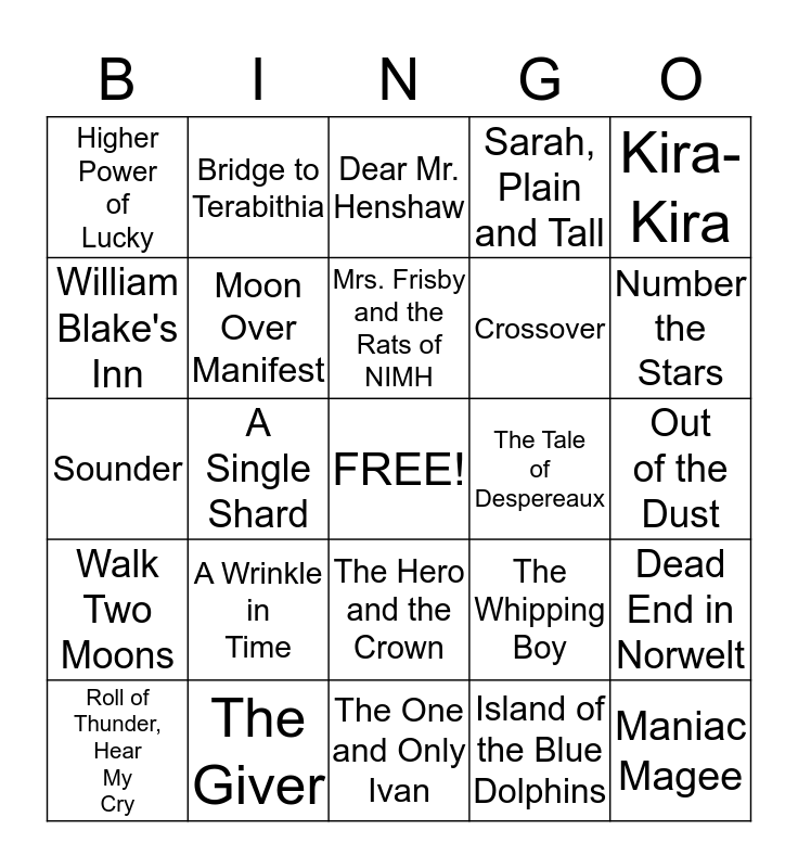 This bingo card has a free space and 36 words: Bud, Not Buddy, Holes, The Graveyard Book, Moon Over Manifest, The Whipping Boy, Walk Two Moons, Mrs. Frisby and the Rats of NIMH, Flora and Ulysses, Kira-Kira, Shiloh, A Single Shard, Sarah, Plain and Tall, Criss Cross, The Tale of Despereaux, Number the Stars, Higher Power of Lucky, When You Reach Me, A Wrinkle in Time, Maniac Magee, Dear Mr. Henshaw, Out of the Dust, Dead End in Norwelt, The Giver, Roll of Thunder, Hear My Cry, The One and Only Ivan, Bridge to Terabithia, Sounder, Crispin:The Cross of Lead, Crossover, William Blake's Inn, A Year Down Yonder, Good Masters!, Island of the Blue Dolphins, The Hero and the Crown, Witch of Blackbird Pond and Last Stop on Market Street.