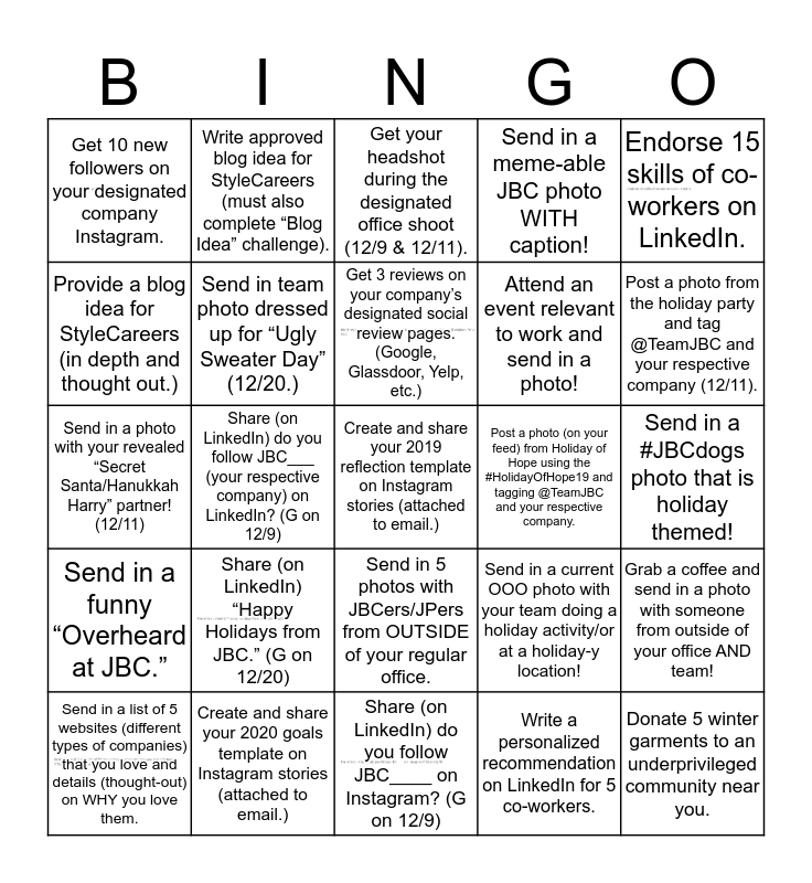This bingo card has 6 images and 25 words: Share (on LinkedIn) “Happy Holidays from JBC.” (G on 12/20), Share (on LinkedIn) do you follow JBC____ on Instagram? (G on 12/9), Get 3 reviews on your company’s designated social review pages. (Google, Glassdoor, Yelp, etc.), Send in a list of 5 websites (different types of companies) that you love and details (thought-out) on WHY you love them., Endorse 15 skills of co-workers on LinkedIn., Get 10 new followers on your designated company Instagram., Provide a blog idea for StyleCareers (in depth and thought out.), Write approved blog idea for StyleCareers (must also complete “Blog Idea” challenge)., Post a photo (on your feed) from Holiday of Hope using the #HolidayOfHope19 and tagging @TeamJBC and your respective company., Send in 5 photos with JBCers/JPers from OUTSIDE of your regular office., Attend an event relevant to work and send in a photo!, Send in a photo with your revealed “Secret Santa/Hanukkah Harry” partner! (12/11), Send in a current OOO photo with your team doing a holiday activity/or at a holiday-y location!, Grab a coffee and send in a photo with someone from outside of your office AND team!, Send in team photo dressed up for “Ugly Sweater Day” (12/20.), Donate 5 winter garments to an underprivileged community near you., Send in a #JBCdogs photo that is holiday themed!, Get your headshot during the designated office shoot (12/9 & 12/11)., Post a photo from the holiday party and tag @TeamJBC and your respective company (12/11)., Share (on LinkedIn) do you follow JBC___ (your respective company) on LinkedIn? (G on 12/9), Create and share your 2019 reflection template on Instagram stories (attached to email.), Create and share your 2020 goals template on Instagram stories (attached to email.), Send in a funny “Overheard at JBC.”, Send in a meme-able JBC photo WITH caption! and Write a personalized recommendation on LinkedIn for 5 co-workers..