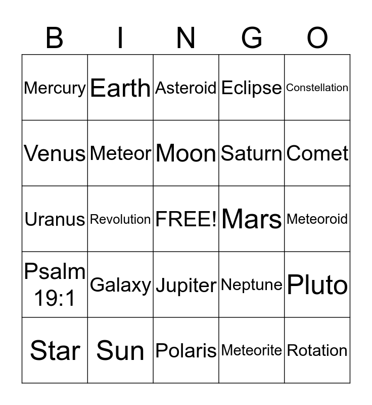 This bingo card has a free space and 24 words: Galaxy, Sun, Moon, Star, Constellation, Mercury, Venus, Earth, Mars, Jupiter, Saturn, Uranus, Neptune, Pluto, Meteor, Meteorite, Meteoroid, Asteroid, Comet, Revolution, Rotation, Psalm 19:1, Eclipse and Polaris.
