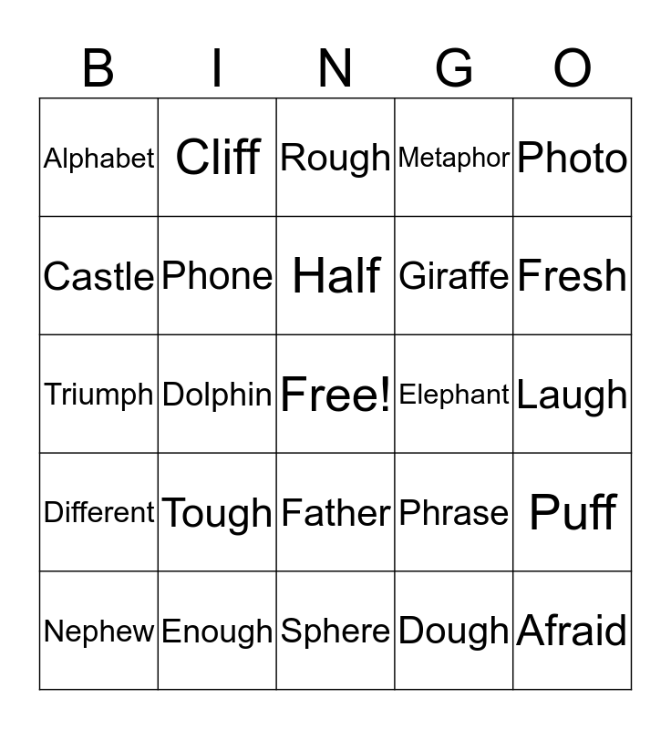 This bingo card has a free space and 29 words: Nephew, Graph, Dolphin, Cough, Alphabet, Rough, Phone, Tough, Elephant, Enough, Laugh, Afraid, Sphere, Dough, Fresh, Trophy, Father, Different, Photo, Triumph, Phrase, Orphan, Giraffe, Castle, Metaphor, Cliff, Puff, Half and Fluff.