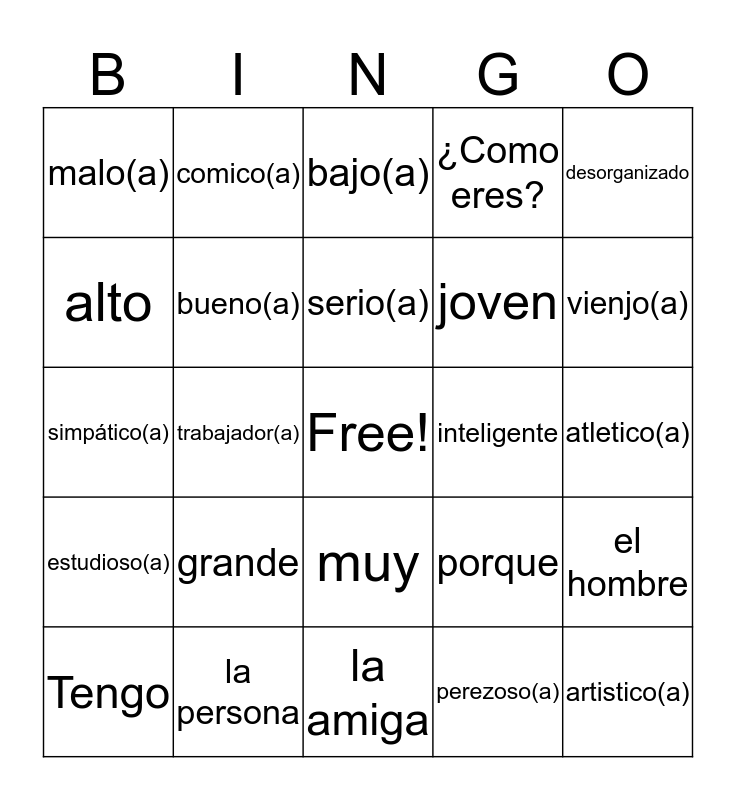 This bingo card has a free space and 24 words: grande, la persona, serio(a), Tengo, desorganizado, malo(a), alto, comico(a), inteligente, muy, joven, simpático(a), porque, el hombre, bueno(a), perezoso(a), atletico(a), bajo(a), vienjo(a), trabajador(a), artistico(a), estudioso(a), ¿Como eres? and la amiga.