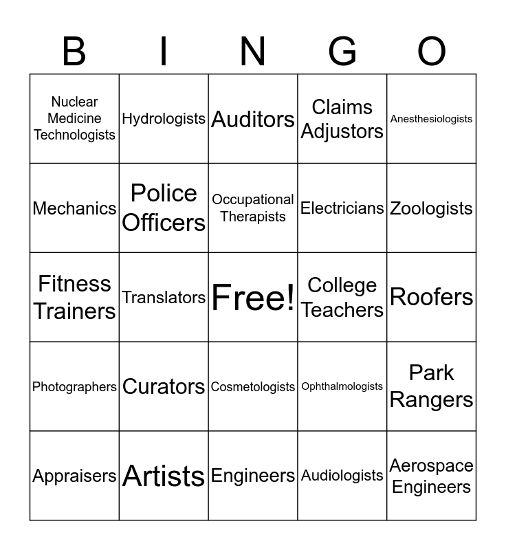 This bingo card has a free space and 45 words: Actuaries, Aerospace Engineers, Broadcast Technicians, Appraisers, Athletic Trainers, Audiologists, Auditors, Biochemists, Anesthesiologists, Artists, Claims Adjustors, College Teachers, Cosmetologists, Curators, Dental Hygienists, Engineers, Human Resources Personnel, Fitness Trainers, Fashion Designers, Zoologists, Hydrologists, Librarians, Loan Officers, Nuclear Medicine Technologists, Lawyers, Roofers, Physical Therapists, Landscaping Supervisors, Ophthalmologists, Photographers, Psychiatrists, Park Rangers, Welders, Veterinarians, Marketing/Sales, Translators, Registered Nurses, Chefs, Web Designers, Occupational Therapists, Mechanics, Electricians, Plumbers, Police Officers and HVAC Technicians.