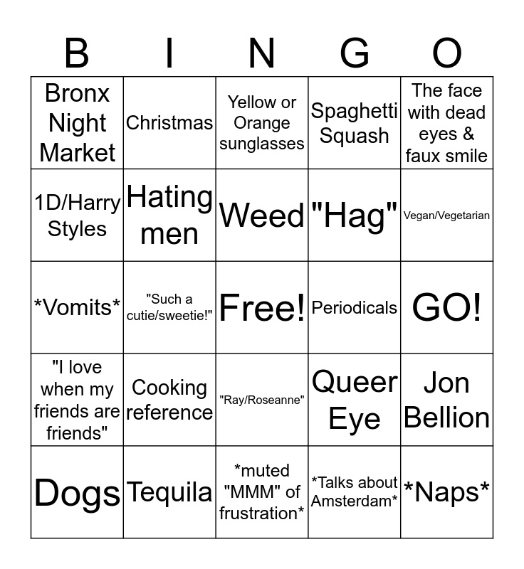 This bingo card has a free space and 24 words: Cooking reference, Tequila, Weed, Dogs, The face with dead eyes & faux smile, Bronx Night Market, 1D/Harry Styles, Christmas, Periodicals, "Ray/Roseanne", "Hag", *Vomits*, Queer Eye, Jon Bellion, Hating men, *Talks about Amsterdam*, GO!, Yellow or Orange sunglasses, Vegan/Vegetarian, "Such a cutie/sweetie!", *Naps*, "I love when my friends are friends", Spaghetti Squash and *muted "MMM" of frustration*.