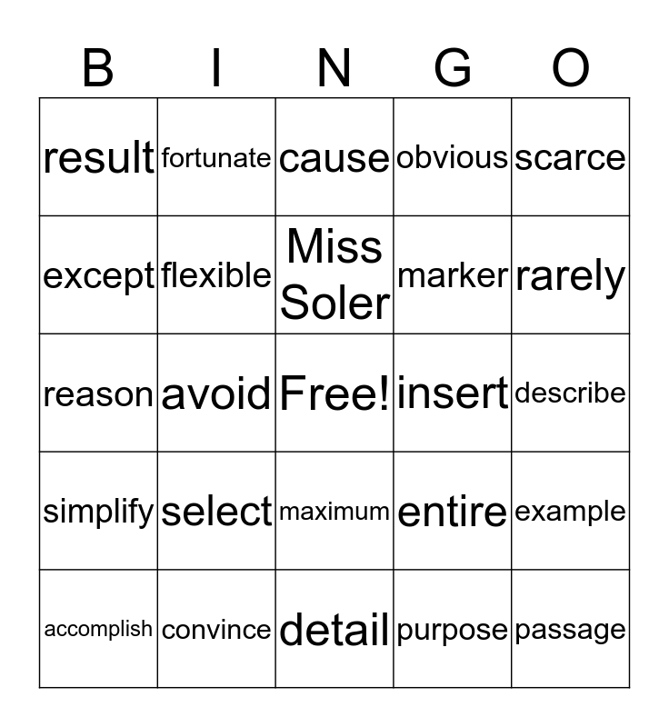 This bingo card has a free space and 29 words: accomplish, border, avoid, compare, result, cause, flexible, select, insert, convince, describe, passage, detail, purpose, rarely, observe, maximum, simplify, scarce, reason, entire, bubbly, marker, except, obvious, fortunate, example, Miss Soler and awesome.