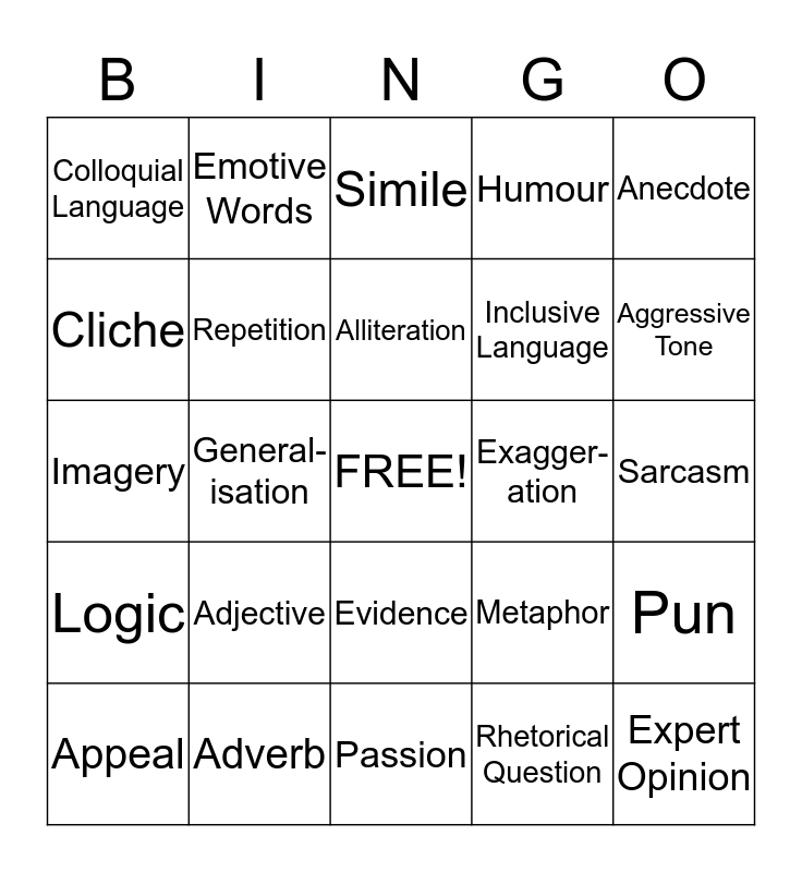 This bingo card has a free space and 24 words: Adjective, Adverb, Alliteration, Appeal, Anecdote, Colloquial Language, Cliche, Emotive Words, Exagger- ation, Evidence, Inclusive Language, Imagery, Metaphor, Pun, Repetition, Rhetorical Question, Sarcasm, Simile, Aggressive Tone, General-isation, Expert Opinion, Logic, Humour and Passion.