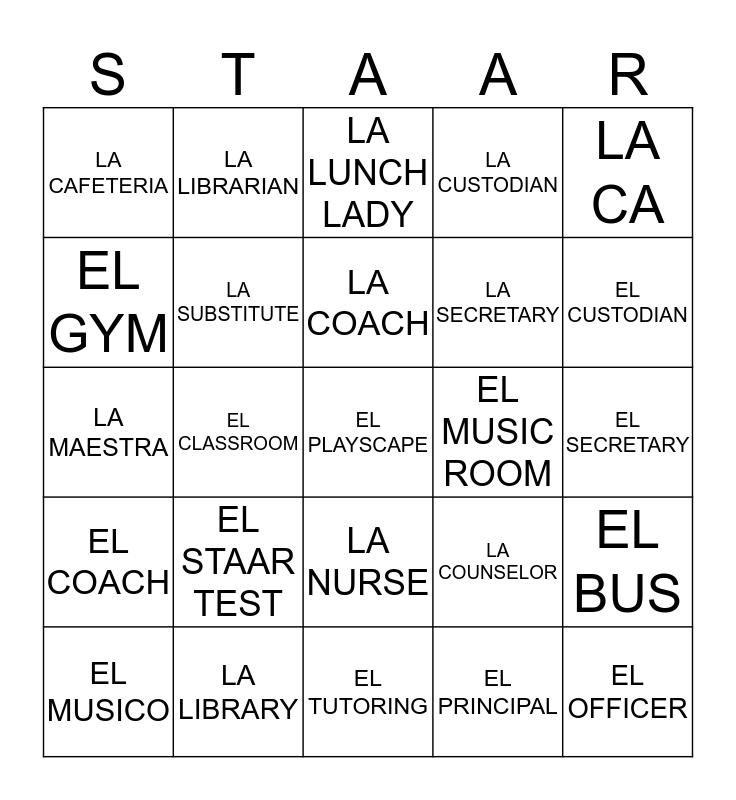 This bingo card has 28 words: EL BUS, EL PORTABLE, LA SECRETARY, EL PRINCIPAL, EL GYM, LA LUNCH LADY, LA LIBRARIAN, EL COACH, EL MUSIC ROOM, EL MUSICO, LA MAESTRA, LA CUSTODIAN, LA LIBRARY, EL TUTORING, EL CUSTODIAN, LA OFFICE, EL STAAR TEST, LA SUBSTITUTE, LA COACH, LA NURSE, LA CAFETERIA, EL OFFICER, EL PLAYSCAPE, EL CLASSROOM, EL SECRETARY, LA COUNSELOR, LA CA and EL BUS DRIVER.
