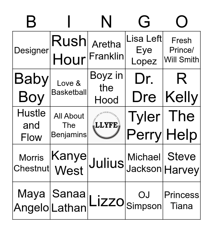 This bingo card has a free space and 25 words: Kanye West, Lizzo, Boyz in the Hood, Maya Angelo, Fresh Prince/ Will Smith, Designer, Baby Boy, Rush Hour, Tyler Perry, Julius, Dr. Dre, Hustle and Flow, Michael Jackson, Steve Harvey, Love & Basketball, Black People, The Help, Aretha Franklin, R Kelly, All About The Benjamins, Princess Tiana, Sanaa Lathan, Morris Chestnut, Lisa Left Eye Lopez and OJ Simpson.