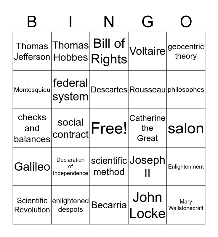 This bingo card has a free space and 29 words: Scientific Revolution, heliocentric theory, social contract, baroque, Thomas Jefferson, Bill of Rights, federal system, Declaration of Independence, Catherine the Great, enlightened despots, salon, Mary Wallstonecraft, Becarria, John Locke, philosophes, Isaac Newton, scientific method, Galileo, geocentric theory, checks and balances, Joseph II, neoclassical, Rousseau, Montesquieu, Voltaire, Thomas Hobbes, Enlightenment, Descartes and Francis Bacon.