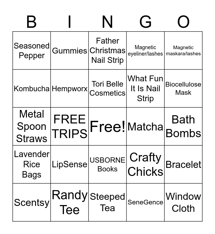 This bingo card has a free space and 73 words: Tastefully Simple, Oh My Chai!, Seasoned Pepper, Cinnamon Muffin Melt, Sara’s Rice Bags, Rice Bags, Lavender Rice Bags, Peppermint Rice Bags, Crafty Chicks, Picture Stands, Stocking Holders, Crafts, Hempworx, Bath Bombs, Hemp Hair Products, Gummies, Steeped Tea, Kombucha, Steeping Sacks, Matcha, Tori Belle Cosmetics, Magnetic eyeliner/lashes, Magnetic maskara/lashes, Eyeshadow, Scentsy, Scentsy Go, Travel Tins, Car Bars, LulaRoe, Leggings, Randy Tee, Irma Tunic, FUN, FUN, FUN, PARTY, FREE TRIPS, HOSTESS BENEFITS, Norwex, EnviroCloth, Window Cloth, Dusting Mitt, SeneGence, LipSense, ShadowSense, LashSense, Color Street, What Fun It Is Nail Strip, Father Christmas Nail Strip, Snow Doubt Nail Strip, Pampered Chef, Metal Spoon Straws, Toy Story Breakfast Set, Quick Salad, 1, 2, 3, 4, 5, USBORNE Books, That’s Not My…, Wipe Cleans, Busy Books, Mary Kay, Charcoal Mask, Biocellulose Mask, Blending Brush, JBloom Jewelry, Necklace, Earrings, Bracelet, 31 Gifts, Large Utility Tote, Cindy Tote and Inspired Crossbody.