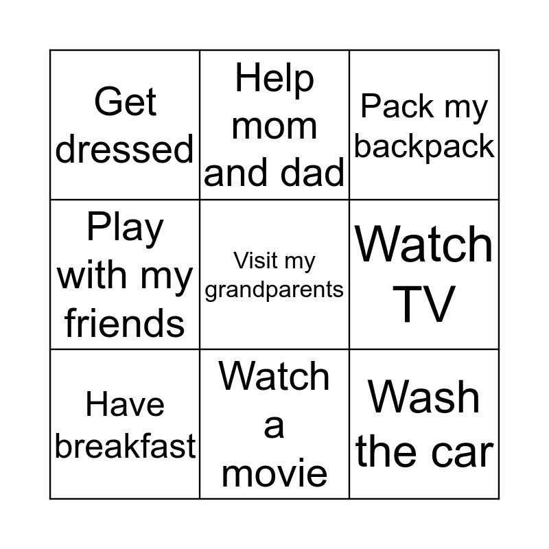 This bingo card has 31 words: Wake up, Brush my teeth, Brush my hair, Take a shower, Get dressed, Pack my backpack, Have breakfast, Set the table, Do the dishes, Take out the rubbish, Feed the animals, Walk the dog, Tidy my room, Go to school, Do my homework, Water the plants, Do the shopping, Go jogging, Ride a horse, Cook a meal, Visit my grandparents, Listen to music, Play an instrument, Help mom and dad, Wash the car, Watch TV, Play with my friends, Go to bed, Do exercise, Watch a movie and Read.