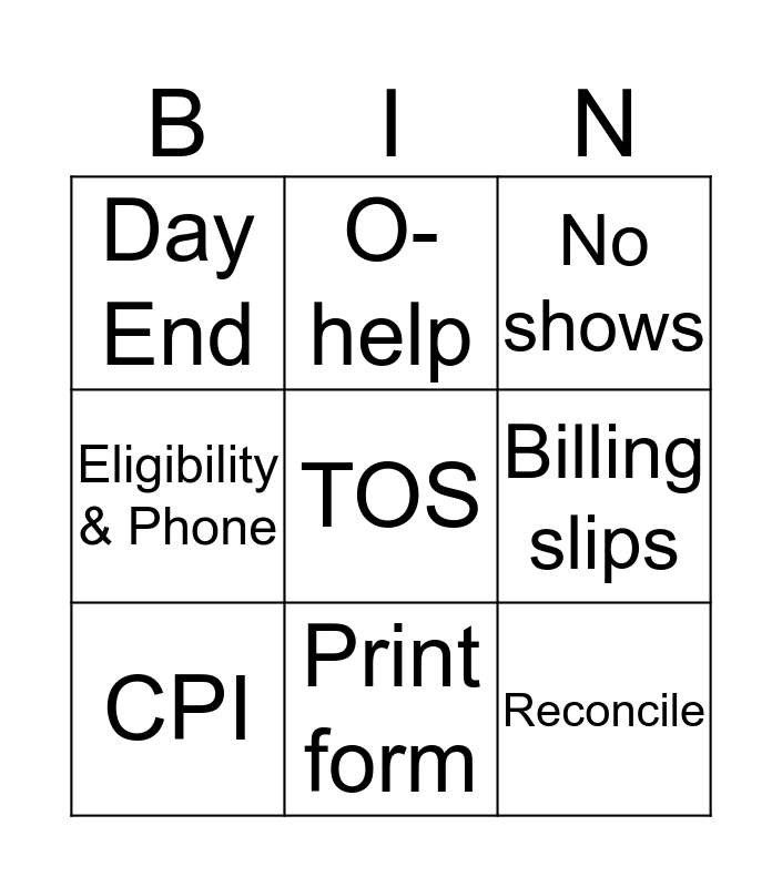This bingo card has 13 words: Quickview, Tickler, CPI, O-help, Eligibility & Phone, TOS, Reconcile, Authorization, Print form, Day End, Billing slips, No shows and Missing slips.
