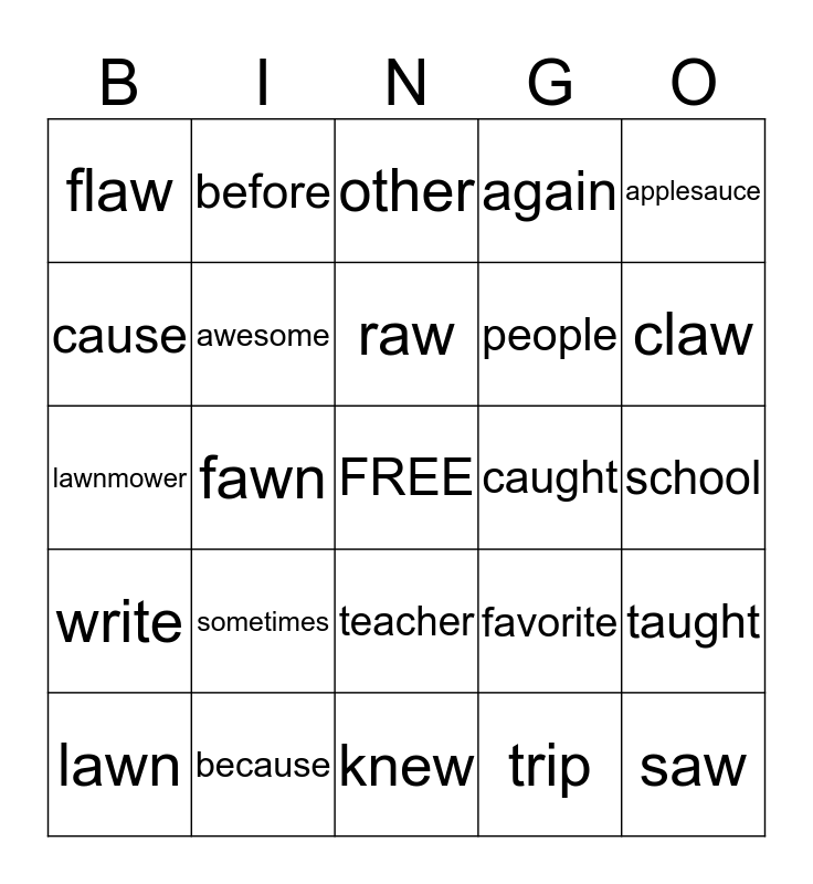 This bingo card has a free space and 24 words: sometimes, because, raw, lawn, applesauce, flaw, cause, before, caught, teacher, people, lawnmower, favorite, taught, awesome, trip, school, other, claw, fawn, saw, write, again and knew.